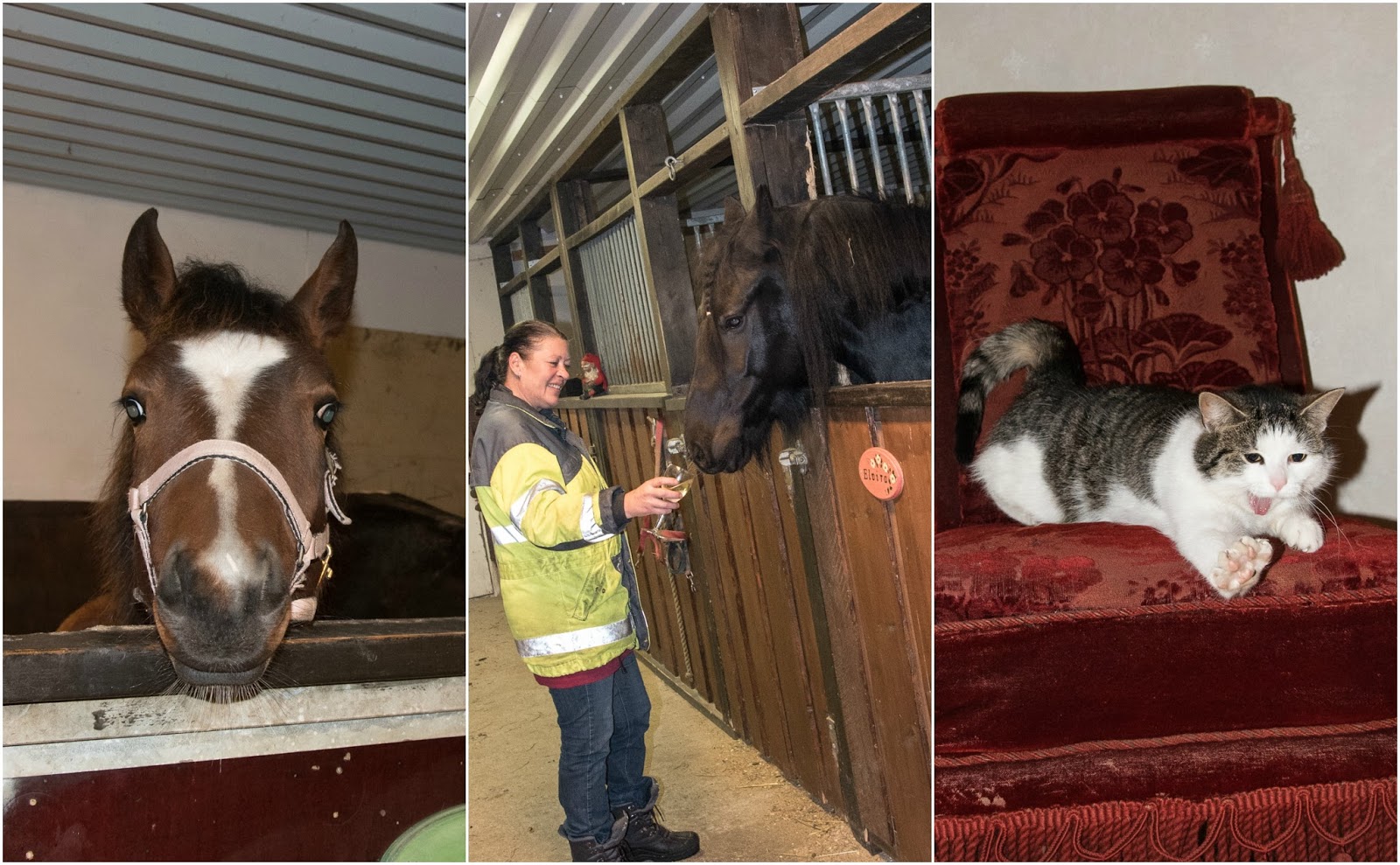Hästarna tyckte det var konstigt att vi kom in till dem mitt i natten men Elvira smakade gärna lite champagne.